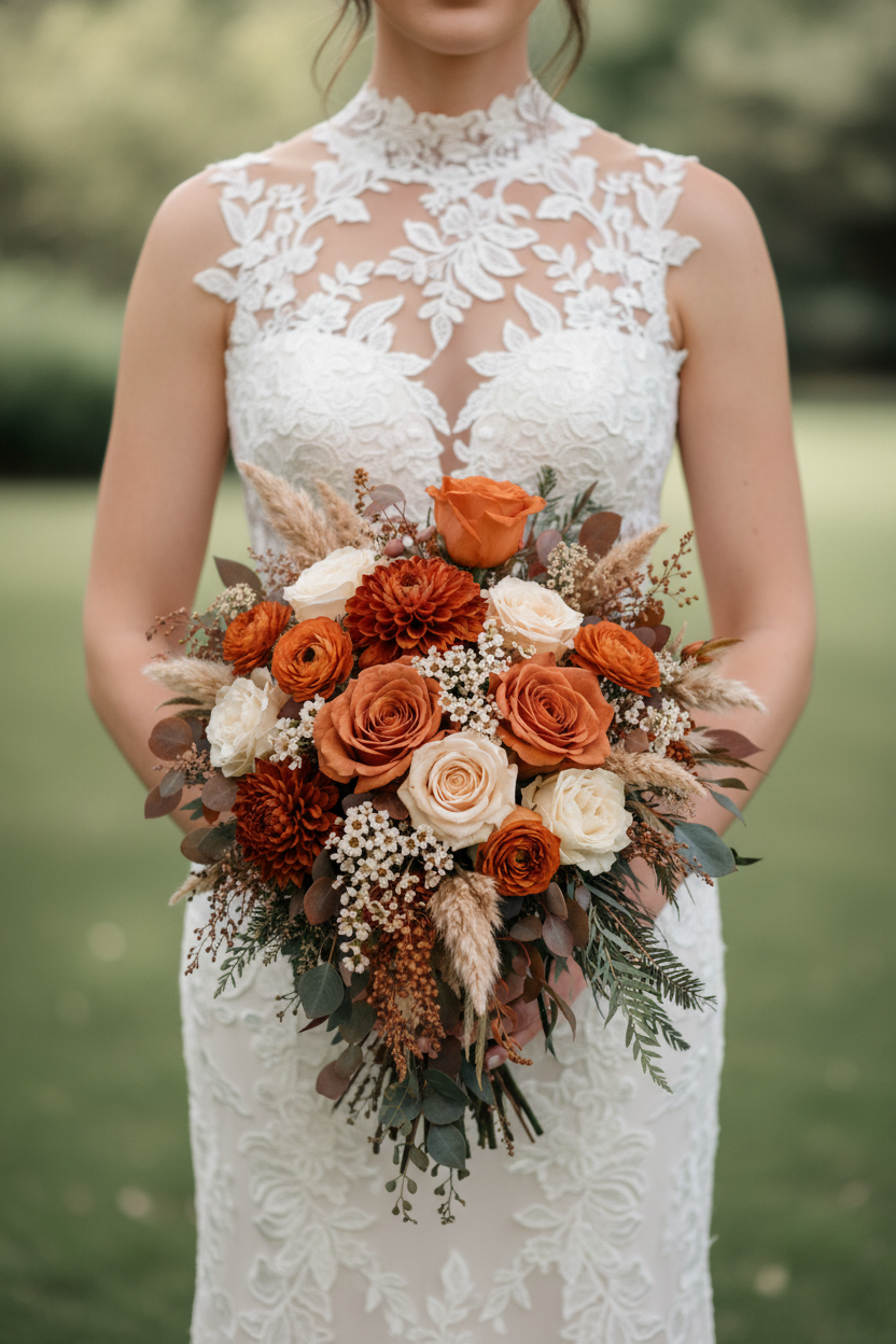 Warm, sunlit bouquets with amber, terracotta, and gold tones.